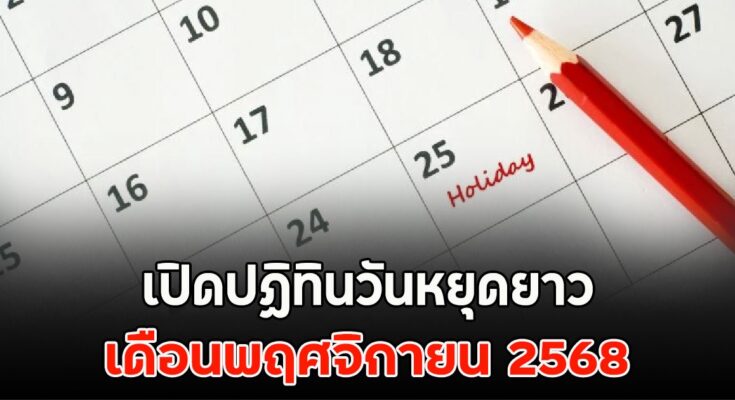 เดือนพฤศจิกายน 2568 เตรียมตัววางแผนเที่ยวได้เลย เพราะไม่มีวันหยุดราชการหรือวันหยุดนักขัตฤกษ์เลยแม้แต่วันเดียว ตลอดทั้งเดือนนี้จึงมีแต่วันหยุดสุดสัปดาห์รวม 8 วัน เท่านั้น (วันเสาร์-อาทิตย์)