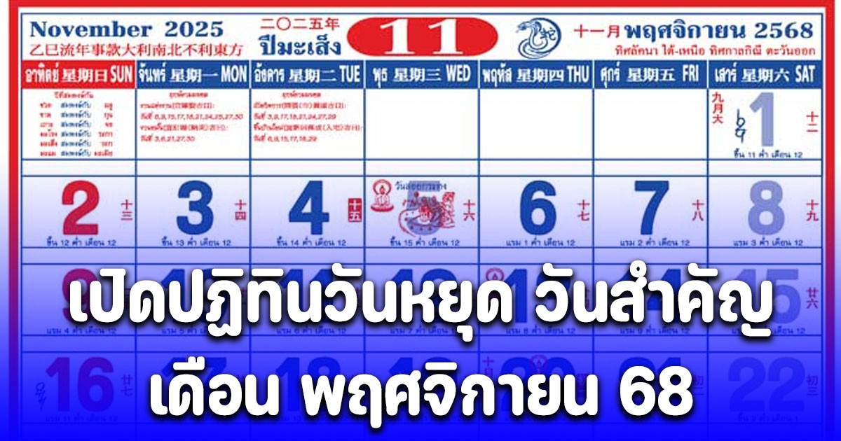 อย่างไรก็ตาม แม้ในเดือนพฤศจิกายน 2568 นี้จะไม่มีวันหยุดเลย แต่ยังมีวันสำคัญทางประเพณีไทย วันลอยกระทง ซึ่งตรงกับวันพุธที่ 5 พ.ย. 68 ขึ้น 15 ค่ำ เดือน 12 ตามปฏิทินจันทรคติไทย