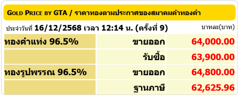 ราคาทองคำ วันที่ 16 ธันวาคม 2568