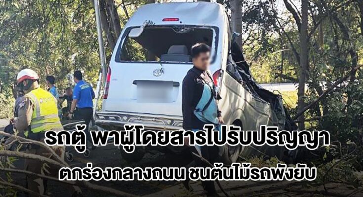 รถตู้ พาผู้โดยสารไปรับปริญญา คนขับวูบหลับใน ตกร่องกลางถนน ชนต้นไม้รถพังยับ เจ็บระนาว