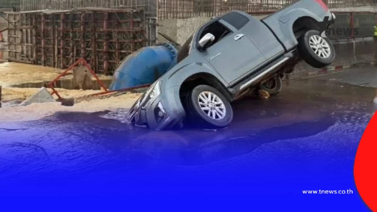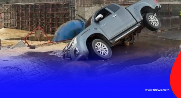 เปิดทะเบียนรถกระบะ ขับมาดีๆอยู่ๆตกหลุมถนนพระราม 2 ที่ทรุดตัว บุญรักษาโชคดีปลอดภัยไม่เป็นอะไรมาก มีแต่รถกระบะที่เสียหาย