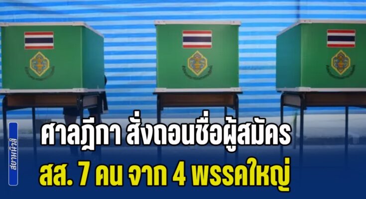 วันนี้ (31 ม.ค. 2569) สำนักงานคณะกรรมการการเลือกตั้ง (กกต.) รายงานความเคลื่อนไหวเกี่ยวกับการตรวจสอบคุณสมบัติผู้สมัคร สส. แบบแบ่งเขตเลือกตั้ง โดยล่าสุดศาลฎีกาได้มีคำสั่ง ให้ถอนชื่อผู้สมัครจำนวน 7 ราย จาก 4 พรรคการเมือง