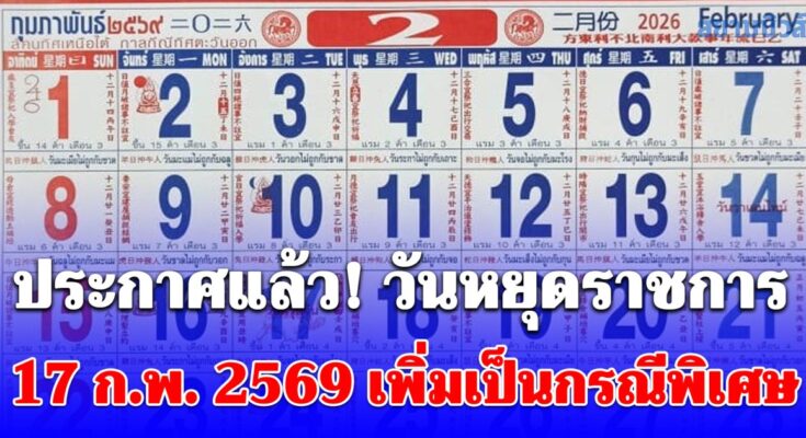 ดังนั้น เพื่อให้เป็นไปตามข้อกำหนดดังกล่าว จึงประกาศให้วันอังคารที่ 17 กุมภาพันธ์ 2569 เป็นวันหยุดราชการ เนื่องในวันตรุษจีน ประจำปีพุทธศักราช 2569 จำนวน 1 วัน ในเขตพื้นที่ที่ระบุไว้ข้างต้น.
