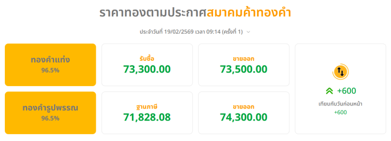 ราคาทองวันนี้ 19 กุมภาพันธ์ 2569 โดย สมาคมค้าทองคำ ประกาศราคาทองครั้งที่ 1 (เปิดตลาด) เมื่อเวลา 09.14 น. ปรับตัวขึ้น 600 บาท สู่บริเวณ 73,500 บาท เมื่อเทียบกับประกาศราคาซื้อขายครั้งสุดท้ายของเมื่อวาน (วันพุธ) ที่ระหว่างวันมีการประกาศราคาทองคำทั้งหมด 16 ครั้ง รวมราคาปรับตัวลดลง 50 บาท