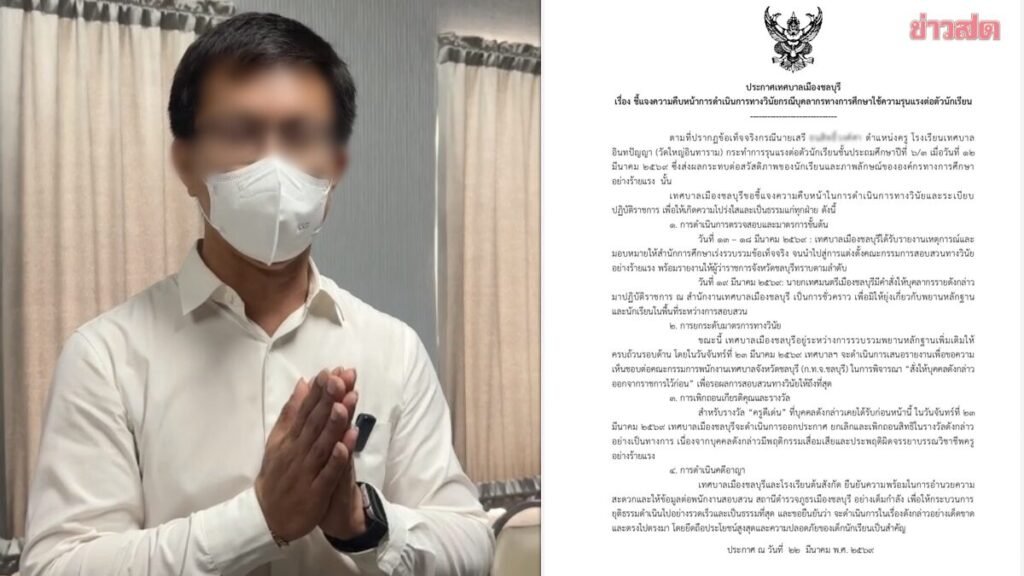 เมื่อวันที่ 22 มี.ค. 69 ความคืบหน้า ผู้ปกครอง น้องเอ (นามสมมติ) นักเรียนชั้น ป.6 ถูก ครูโรงเรียนเทศบาลวัดใหญ่อินทราราม จ.ชลบุรี และมีตำแหน่งเป็นถึง
