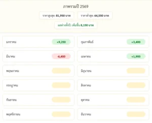 เรียกว่าราคาทองล่าสุดในปี 2569 เพิ่มขึ้นอย่างต่อเนื่องตั้งแต่ต้นปี โดยจากต้นปีจนถึงปัจจุบันราคาเพิ่มขึ้นอีก 8,150 บาท ถือว่าเป็นการปรับราคาขึ้นต่อเนื่องจากปี 2568 ที่ผ่านมา ซึ่งใน 1 ปีที่ผ่านมาดังกล่าวราคาทองเพิ่มขึ้นถึง 22,550 บาทเลยทีเดียว