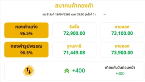 และปัจจุบัน ประกาศล่าสุด วันเสาร์ที่ 18 เมษายน 2569 ประกาศครั้งเดียว เวลา 09.00 น. ปรับขึ้น 400 บาท ส่งผลให้ราคาทองอยู่ที่